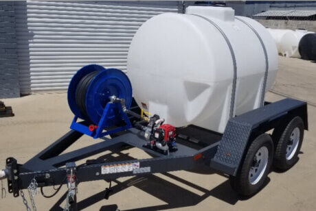 The 525 gallon water trailer is offered in four different setups. This medium sized trailer has the featured benefits of still being easily maneuvered, but also contains a good amount of water. This trailer will require a tow vehicle at least the size of 1/2 ton pickup.